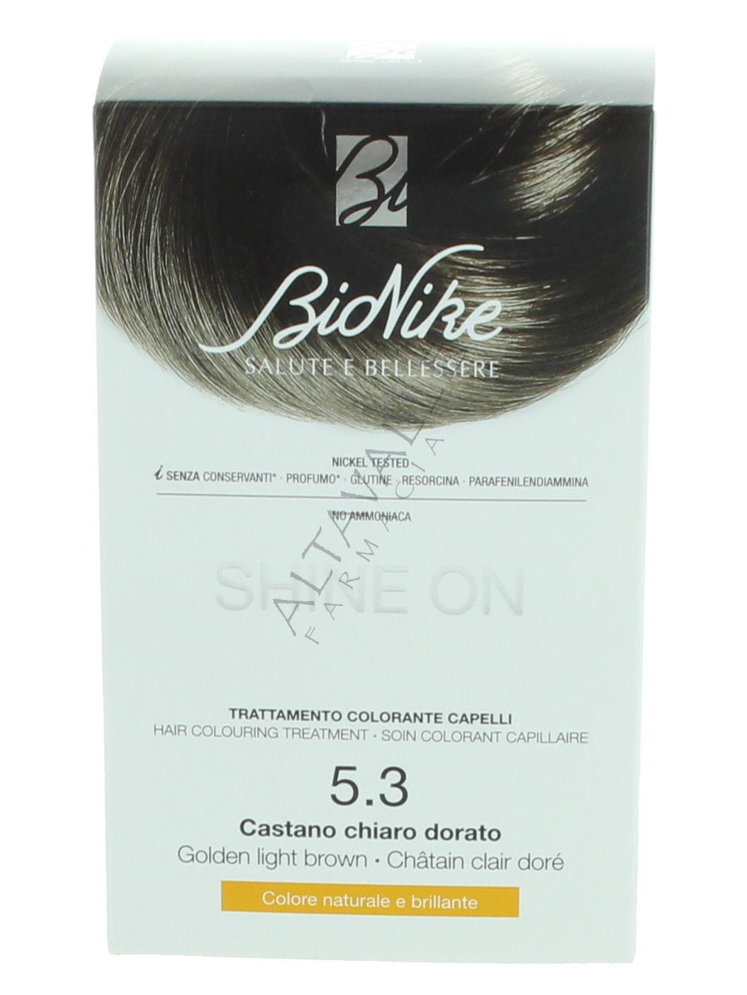 Bionike Shine On Tinta Castano Chiaro Dorato 5.3 è una tintura permanente studiata per offrire una colorazione naturale e brillante ideata per il cuoio capelluto (cute) sensibile;