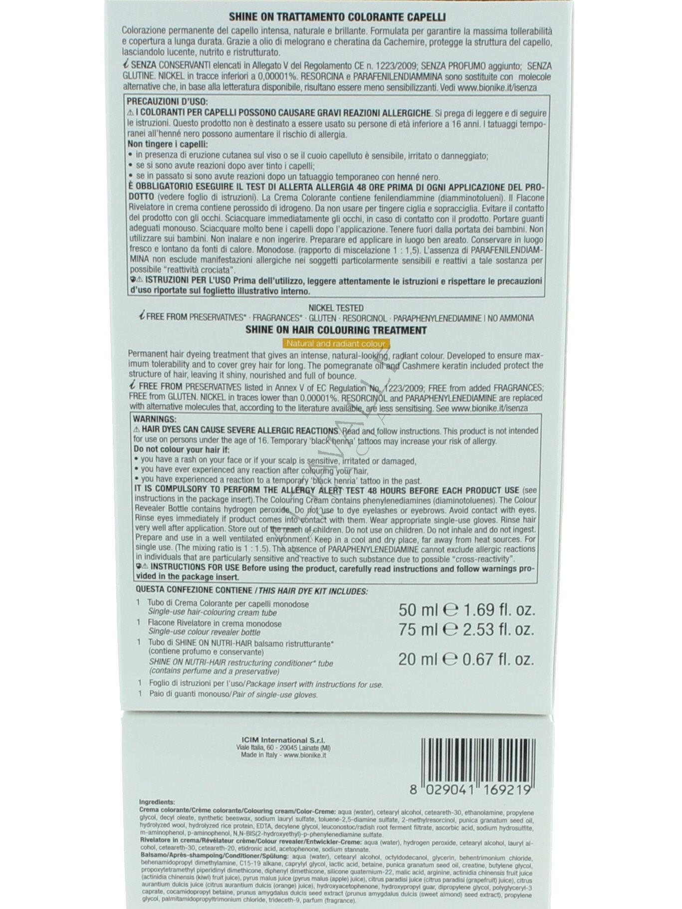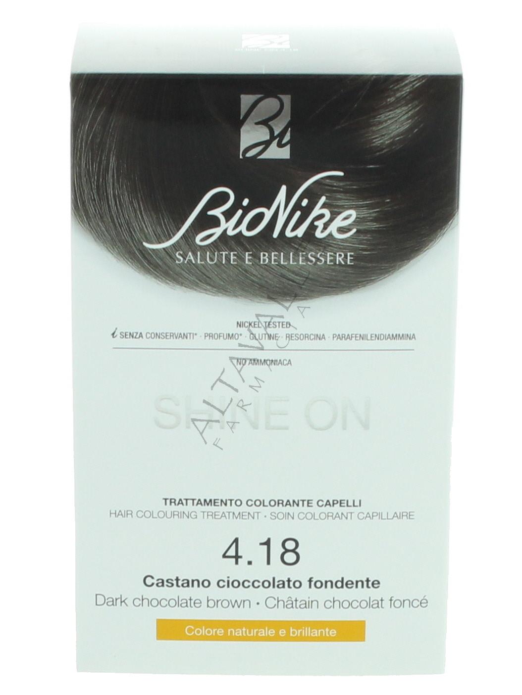 Bionike Shine On Tinta Castano Cioccolato Fondente 4.18 è una tintura permanente studiata per offrire una colorazione naturale e brillante ideata per il cuoio capelluto (cute) sensibile;